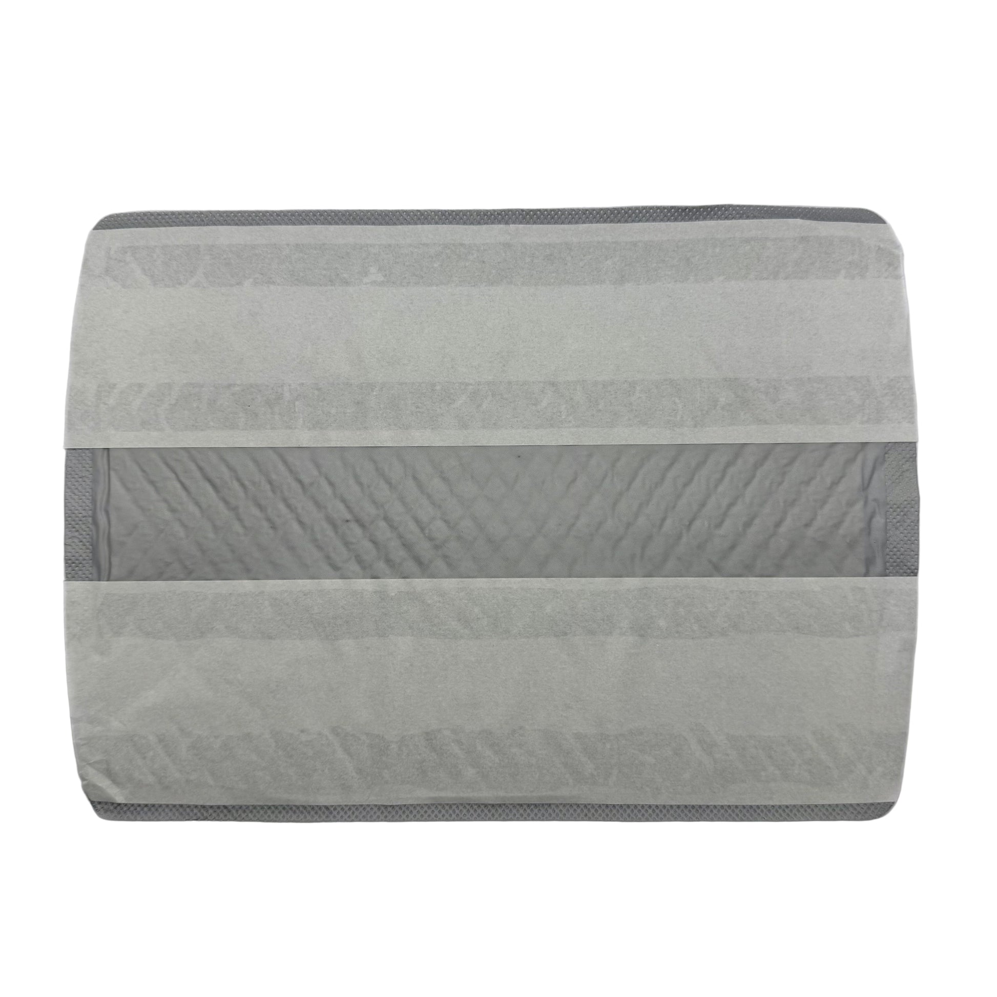 Image Description: A rectangular absorbent pad with a quilted white surface and a soft grey border. The images show the pad being placed inside clothing on both the front and back, and also shown as a set of multiple pads stacked together.