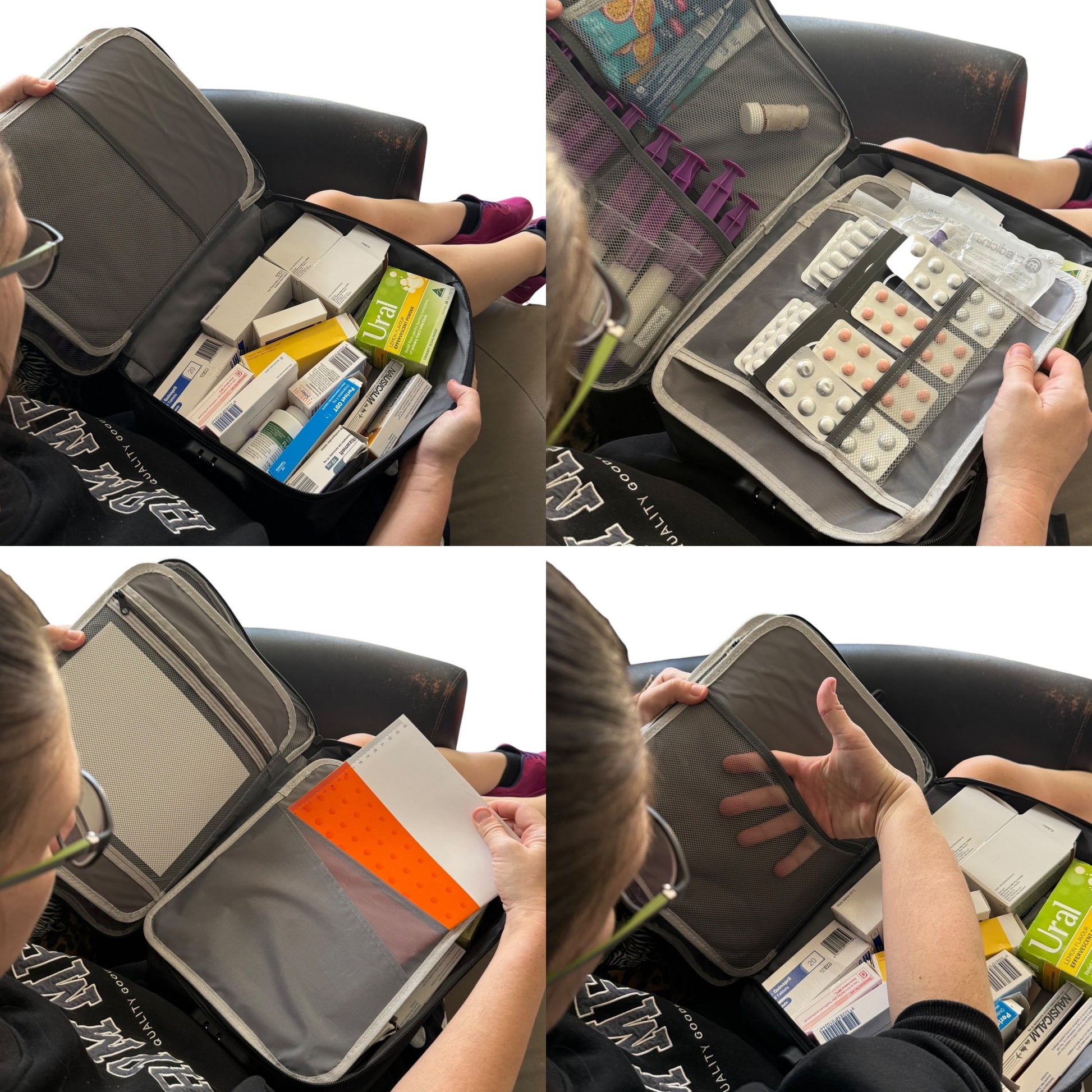 Image Description: Grey structured storage case opened to reveal layered compartments, mesh pockets, and document sections designed for organising medications, paperwork, and important personal items.