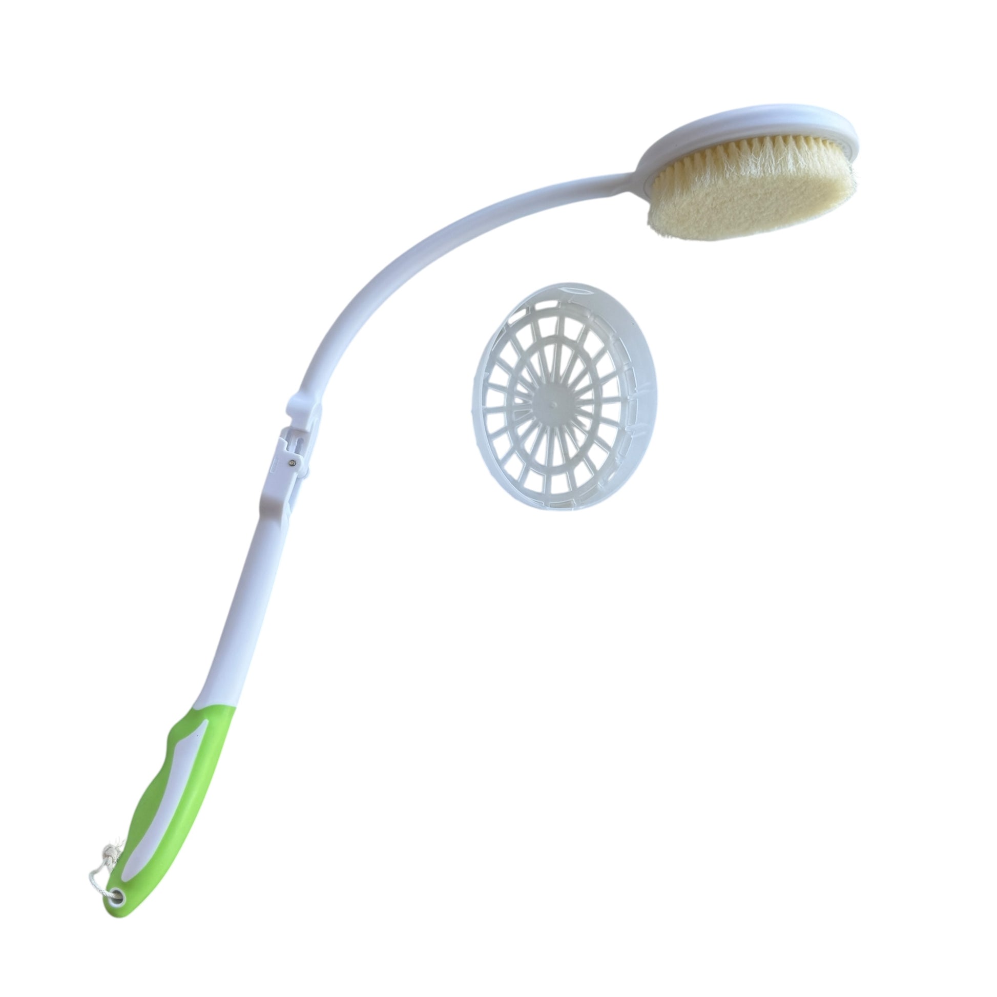 This folding long-handled brush gives you extra reach for cleaning your back, shoulders, legs, and lower body, with soft bristles that feel gentle on skin. You can use it wet with soap and water, or on dry skin for a light exfoliating scrub.
