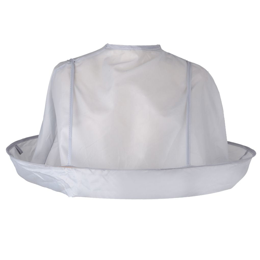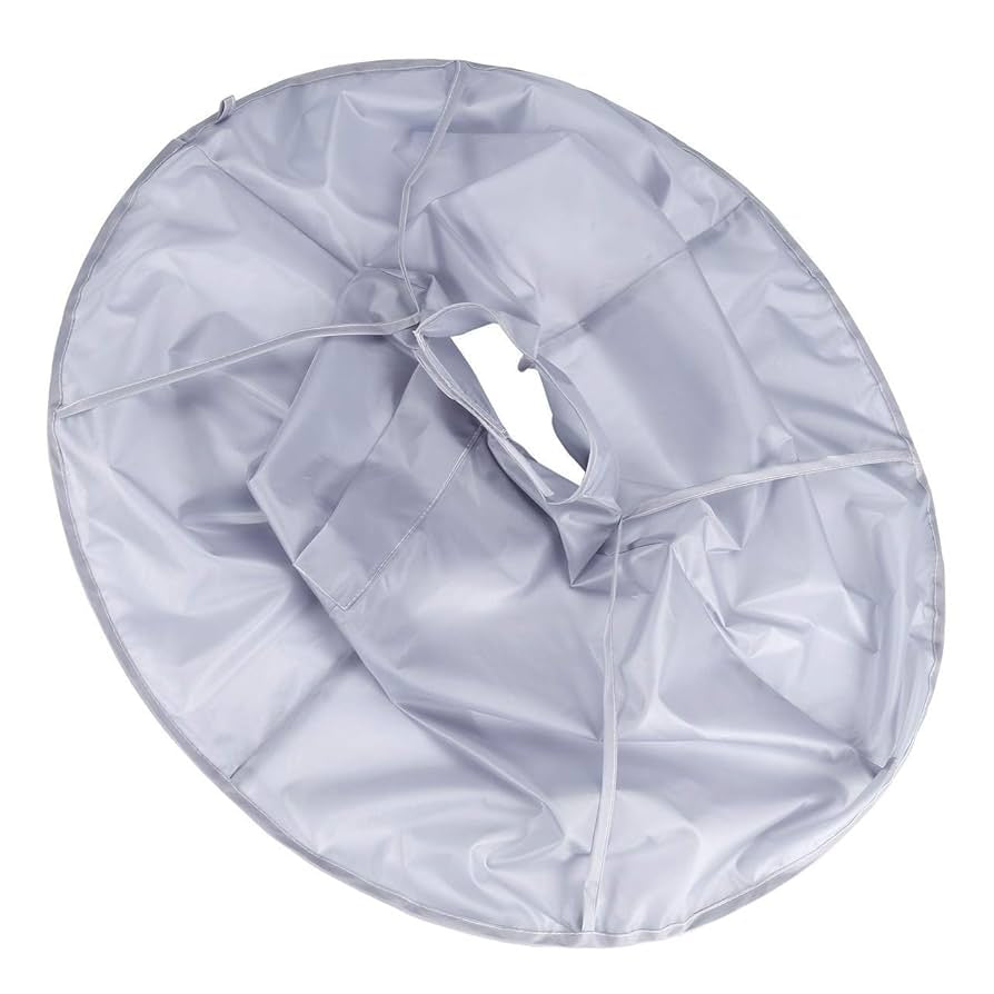 Product Description: A silver grey circular haircutting cape shaped like an umbrella that fits around the neck and shoulders, catching hair and beard trimmings before they fall.