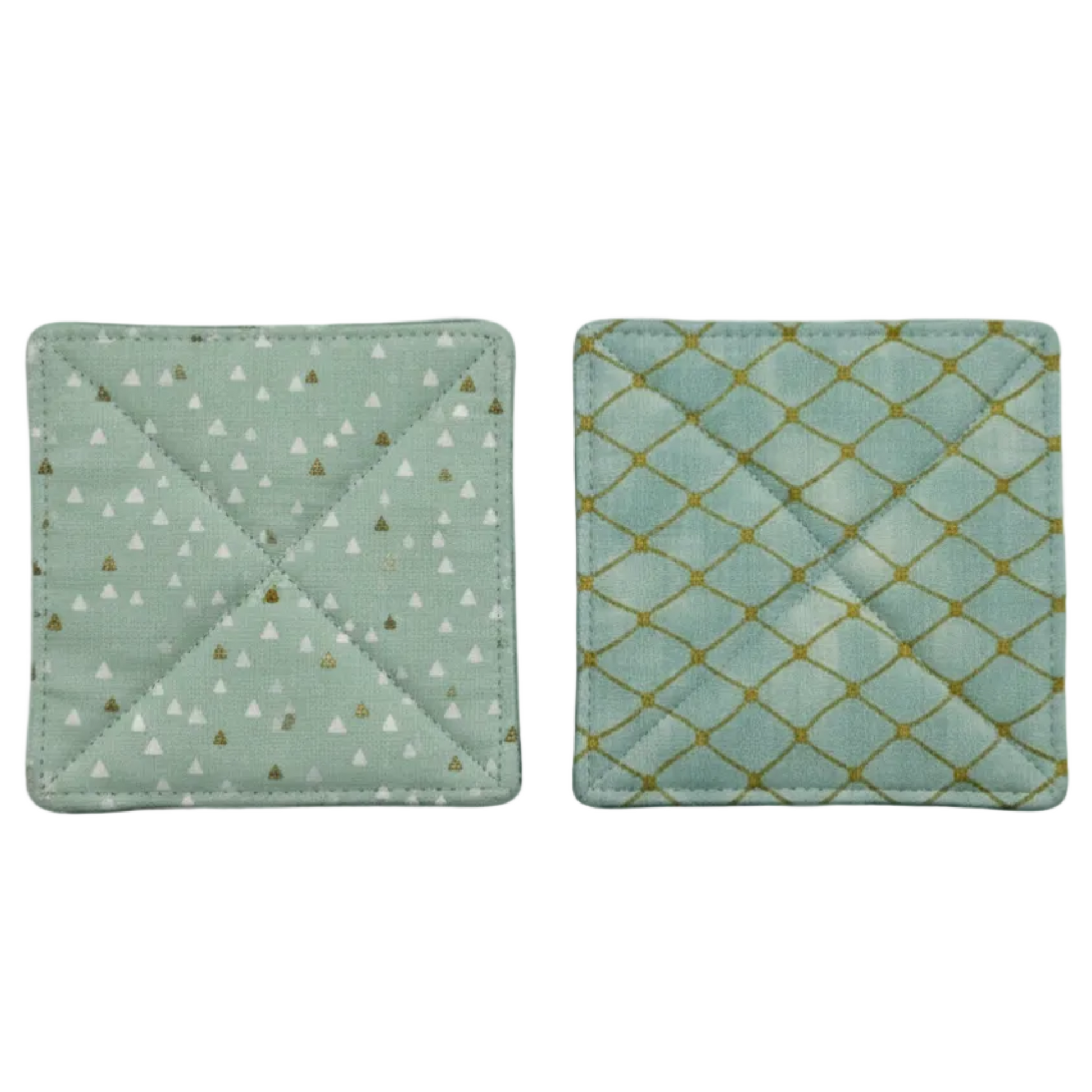 Image Description: A set of handmade quilted coasters featuring a mix of soft greens and patterned fabrics. The front side shows patchwork-style squares in complementary prints, and the reverse side is a textured green fabric with stitched quilting lines forming a cross pattern. Coasters are soft, neatly stitched and square in shape.