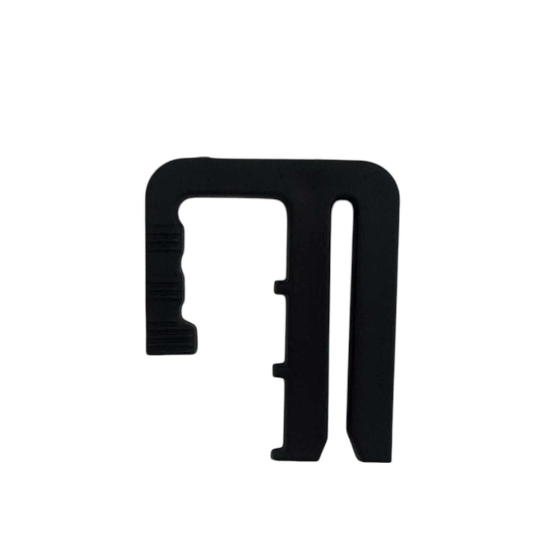 Image Description: A small black plastic waistband clip is shown on its own and being used on denim jeans. The clip hooks onto the waistband to gather the fabric and tighten the waist for a more secure fit. One image shows the clip worn on the back waistband, sitting flat and discreet under a shirt. Other images show the clip being attached by hand, demonstrating how it grips the waistband to reduce looseness.