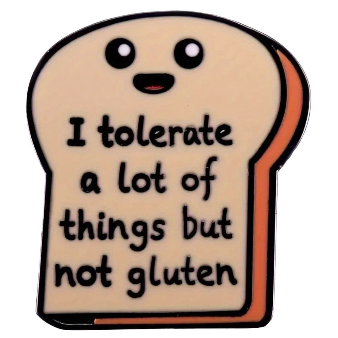 Image Description: A cartoon style enamel pin shaped like a slice of bread with a smiling face, wide eyes, and a small open mouth. The bread is outlined in black with a lightly toasted edge. The text reads: “I tolerate a lot of things but not gluten” in bold black lettering.