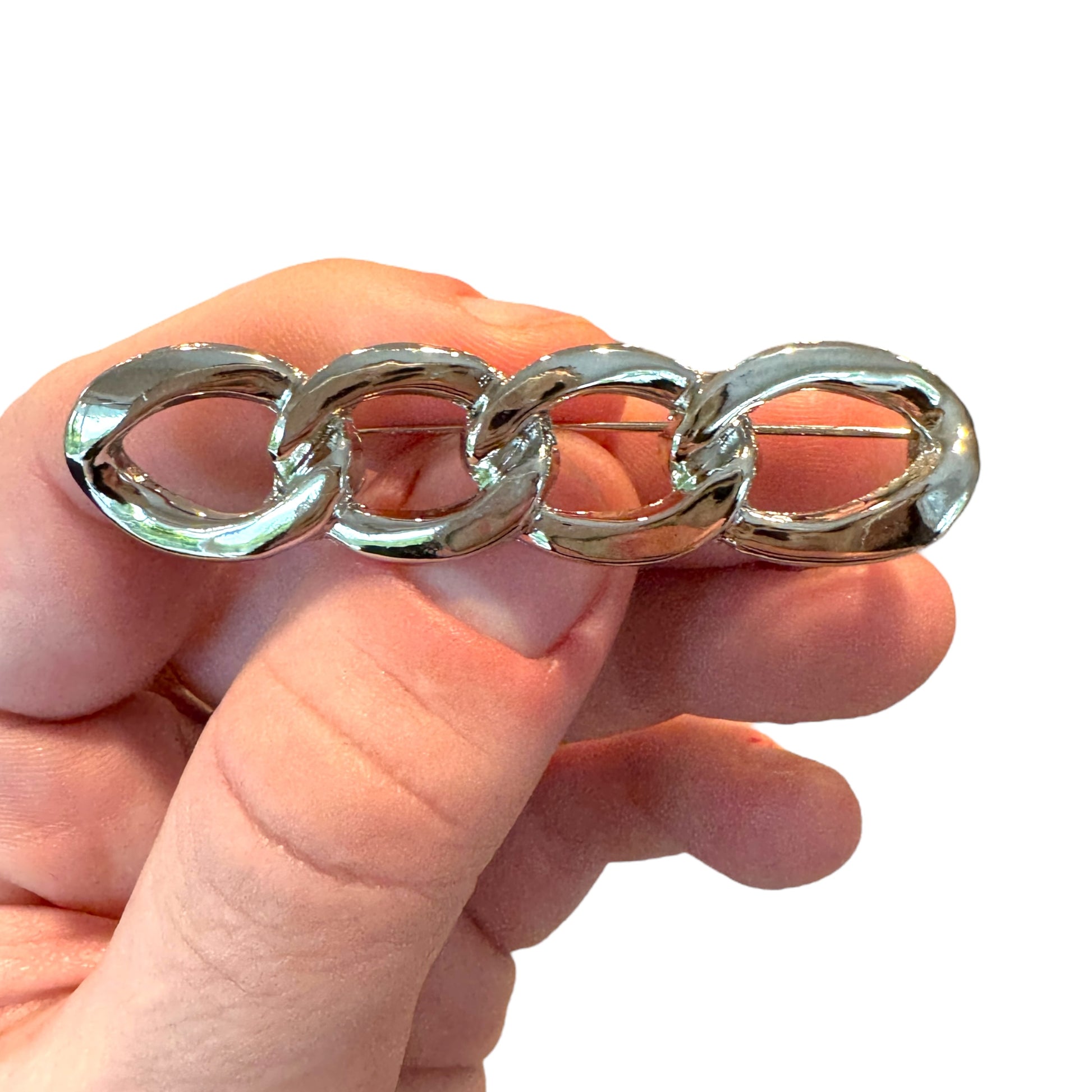 Image Description: A silver metal waist pin featuring a short, chunky chain with two flat clip ends designed to grip fabric securely. The pin is shown fastened across the back waistband of a pair of jeans, gently pulling the fabric in to create a closer, more comfortable fit. The chain rests neatly against the denim, adding a subtle yet stylish detail to the look.
