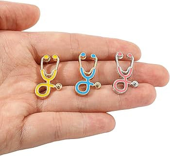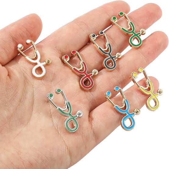 Image Description: A small enamel pin shaped like a stethoscope with a gold-tone outline and coloured tubing. Colour options include black, beige, navy, green, red, teal, and soft pink. The chest piece and ear tips are detailed in gold.