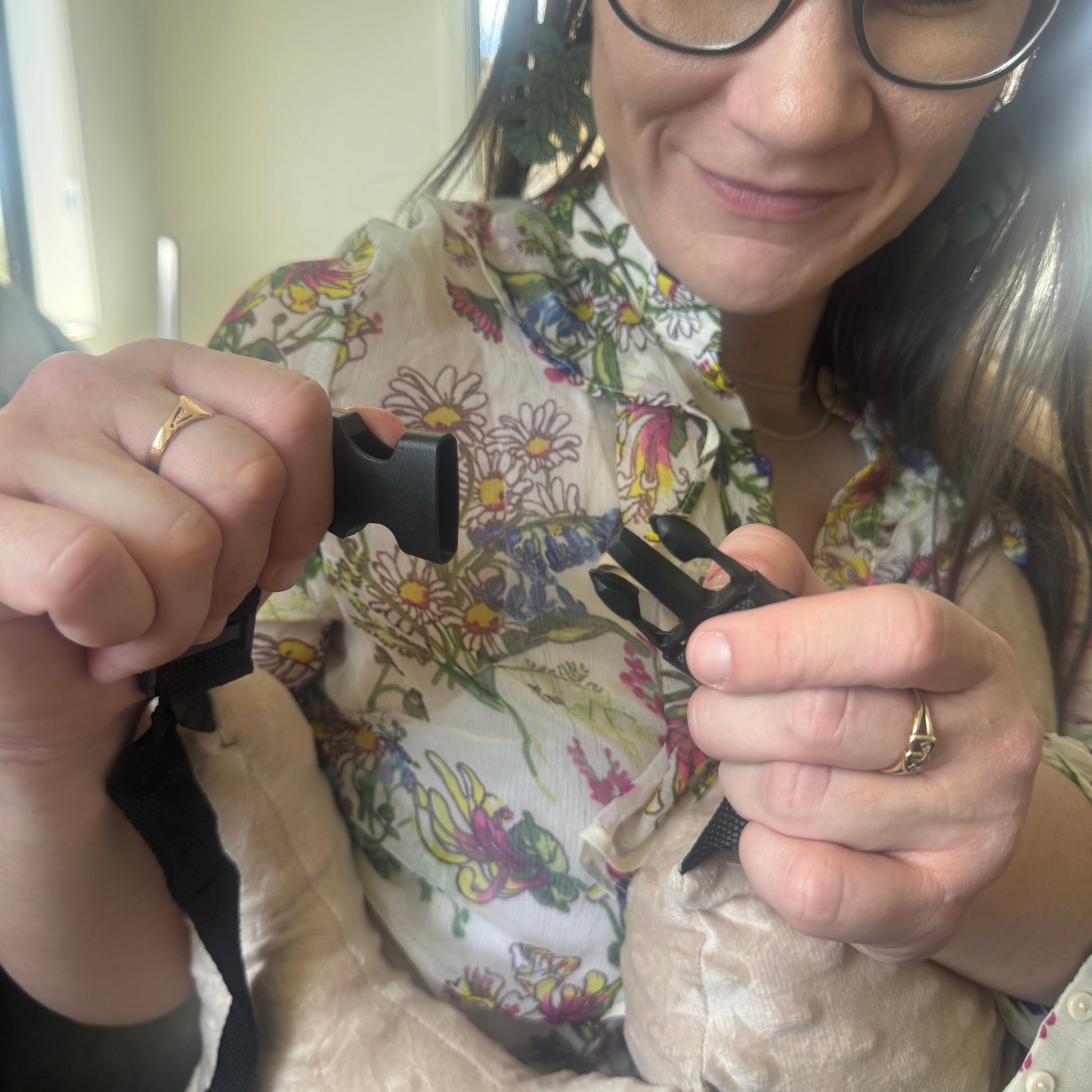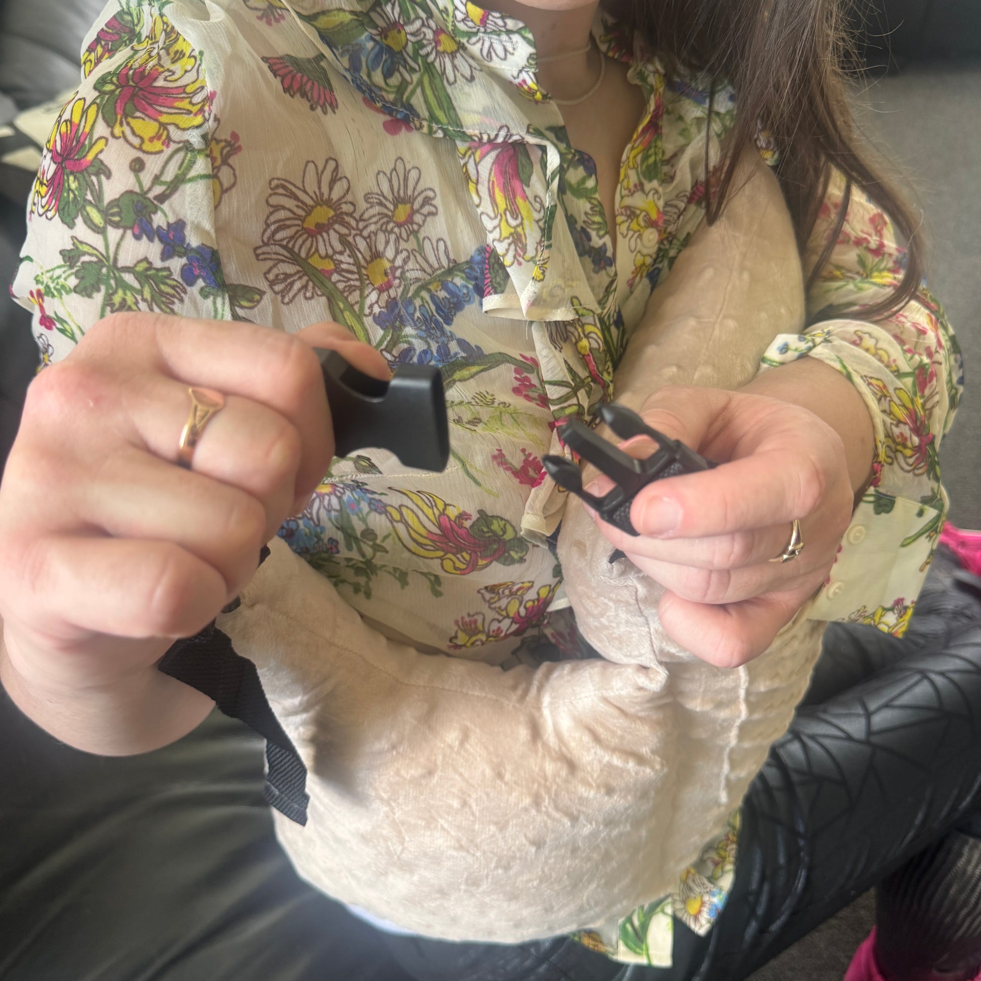 It’s shaped to wrap comfortably around the body, with raised sides to cushion under the arms and a central section that rests softly across the chest or tummy. A handy strap helps keep it in place, and a front and back pocket can hold small essentials like your phone, tissues, or a cold pack.