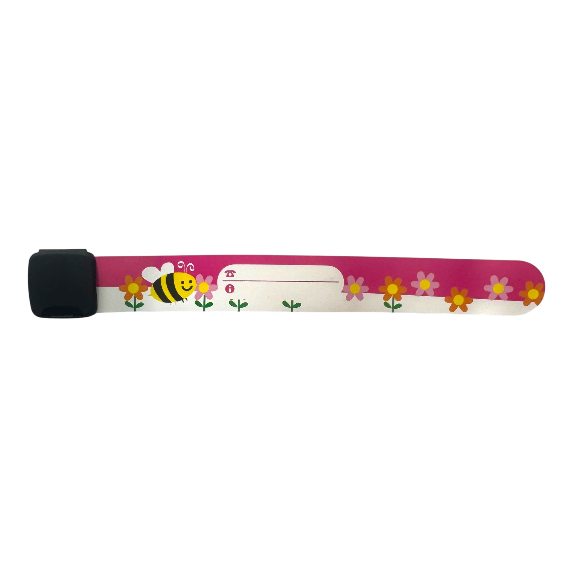 Image Description: A range of colourful adjustable safety ID bracelets with a writable name panel and secure black safety clip. Shown worn on children’s and adults’ wrists, displayed both flat and in use, with multiple bright patterns available.