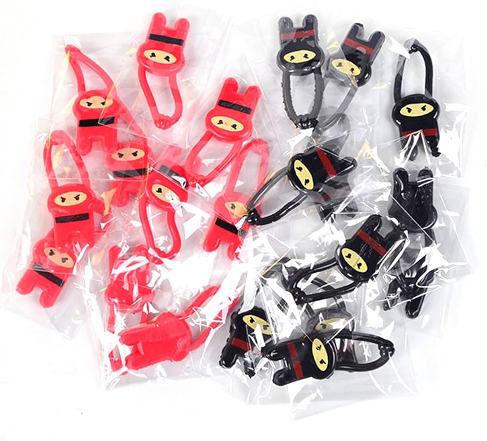 Image Description: Small red and black samurai-shaped stretchy launch toys with looped arms and a flexible body. Designed to hook onto a finger, pull back, and release to send them flying.
