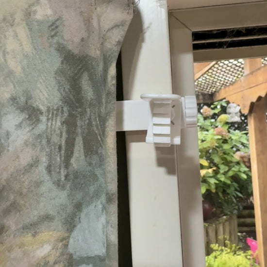 Image description: A white adjustable clamp fixed to window and door frames. One image shows the clamp holding a curtain rod, while another shows it supporting an IV hydration bag beside a window. The clamp features a rotating knob for tightening and a curved grip for secure hold.