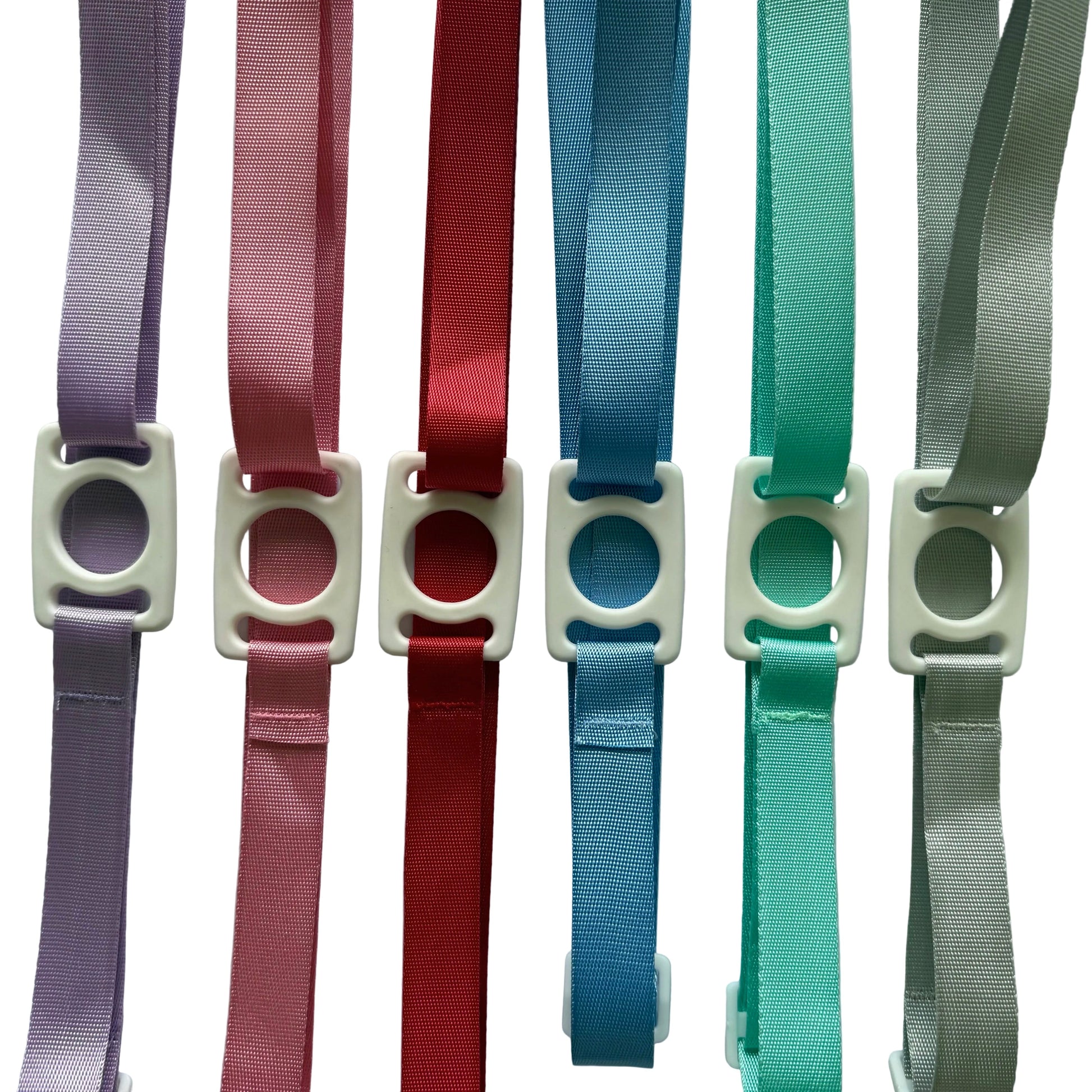 Image Description: Adjustable woven bottle holder straps shown in multiple colours including red, pink, purple, green, blue, and grey. Each strap features a plastic circular holder designed to sit securely under a bottle lid, with an adjustable buckle for length customisation.