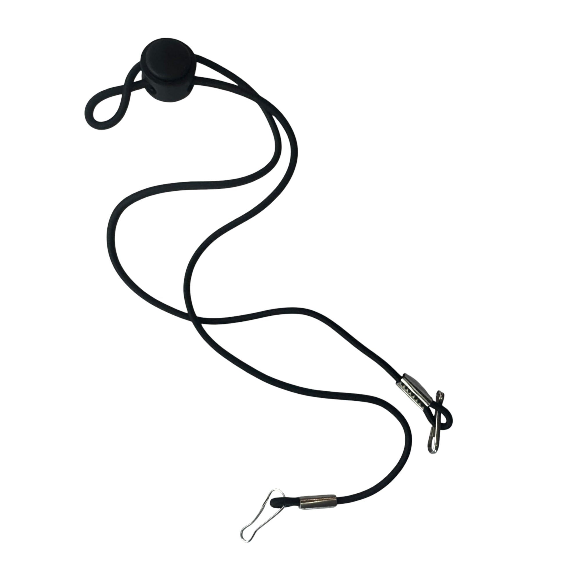 Image Description: A collection of elastic glasses and mask lanyards available in multiple colours including black, red, blue, green, purple, clear and neutral tones. Each strap features a central adjustable toggle and metal end attachments designed to connect securely to glasses arms or mask loops.