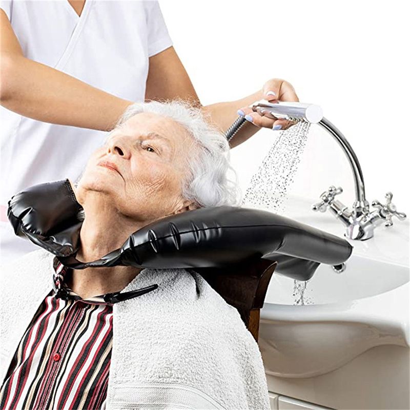 Image description: A black inflatable shampoo pillow shown in use in several settings. The pillow is U-shaped with a curved neck opening, designed to support the head and neck while washing hair. Images show a person lying back with their head resting comfortably in the pillow as water is poured over their hair, with the raised sides helping to contain water. The pillow is shown being used at a salon sink, bedside, and in a home care setting, highlighting its flexibility for seated, lying down, and assisted hair washing.