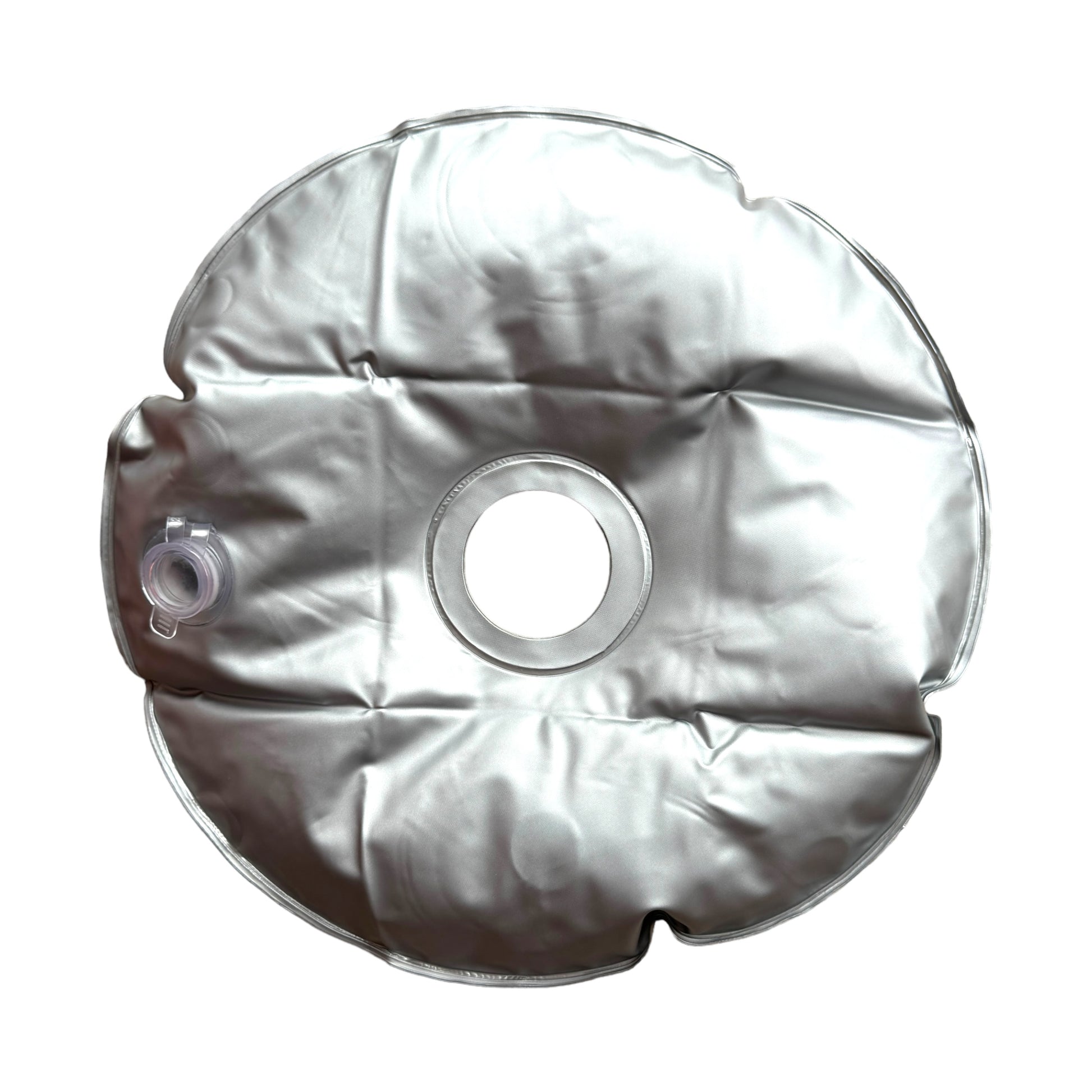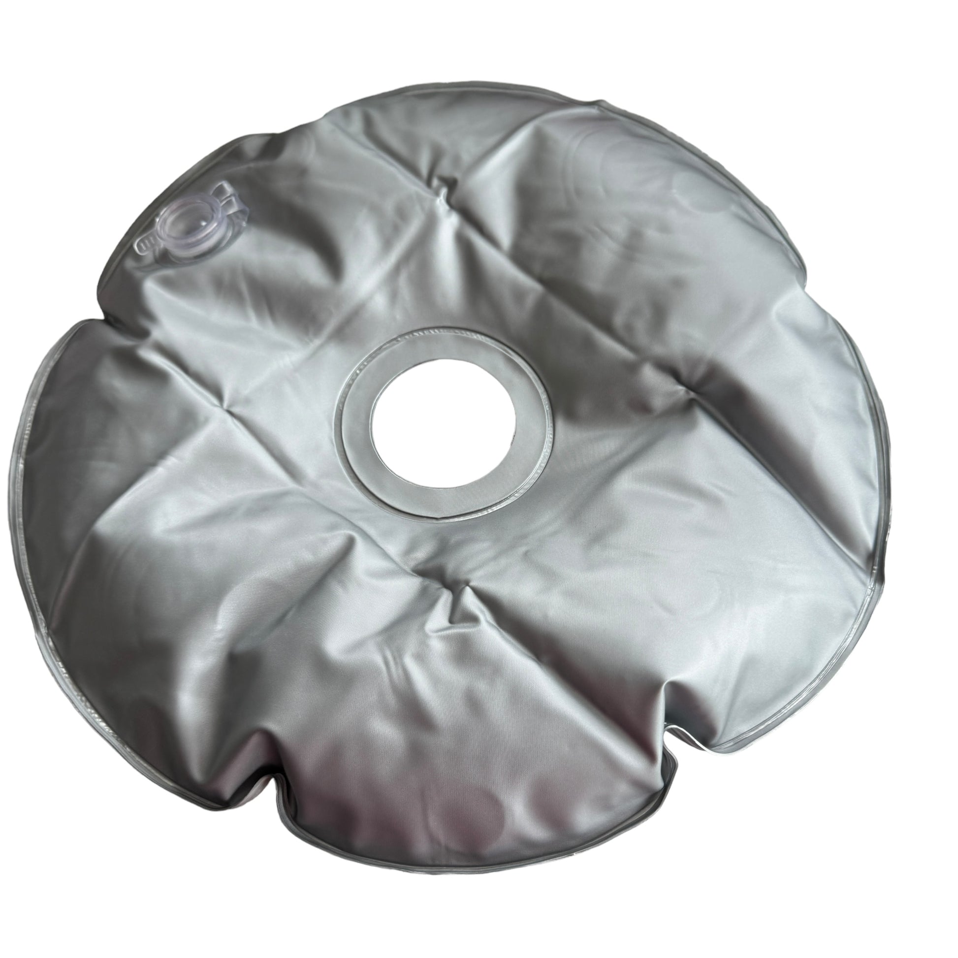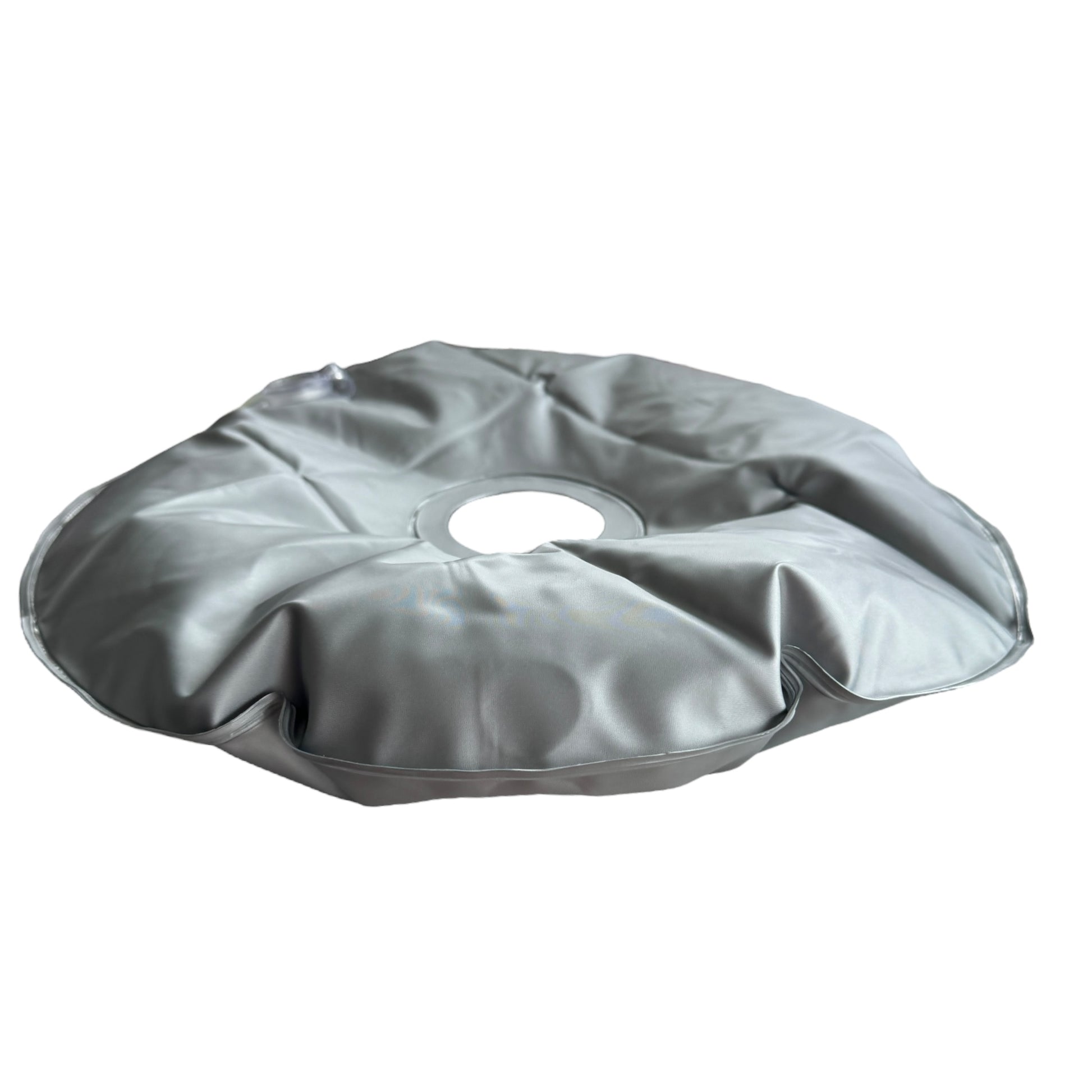 Image Description: A silver and circular pillow with a circular inner cut out for threading the balance weight onto the pole to sit around the pole and the legs of the stand once it’s been filled with water. There is a large opening plug to fill the item with water to give the stand weighted counter balance that you want for it.