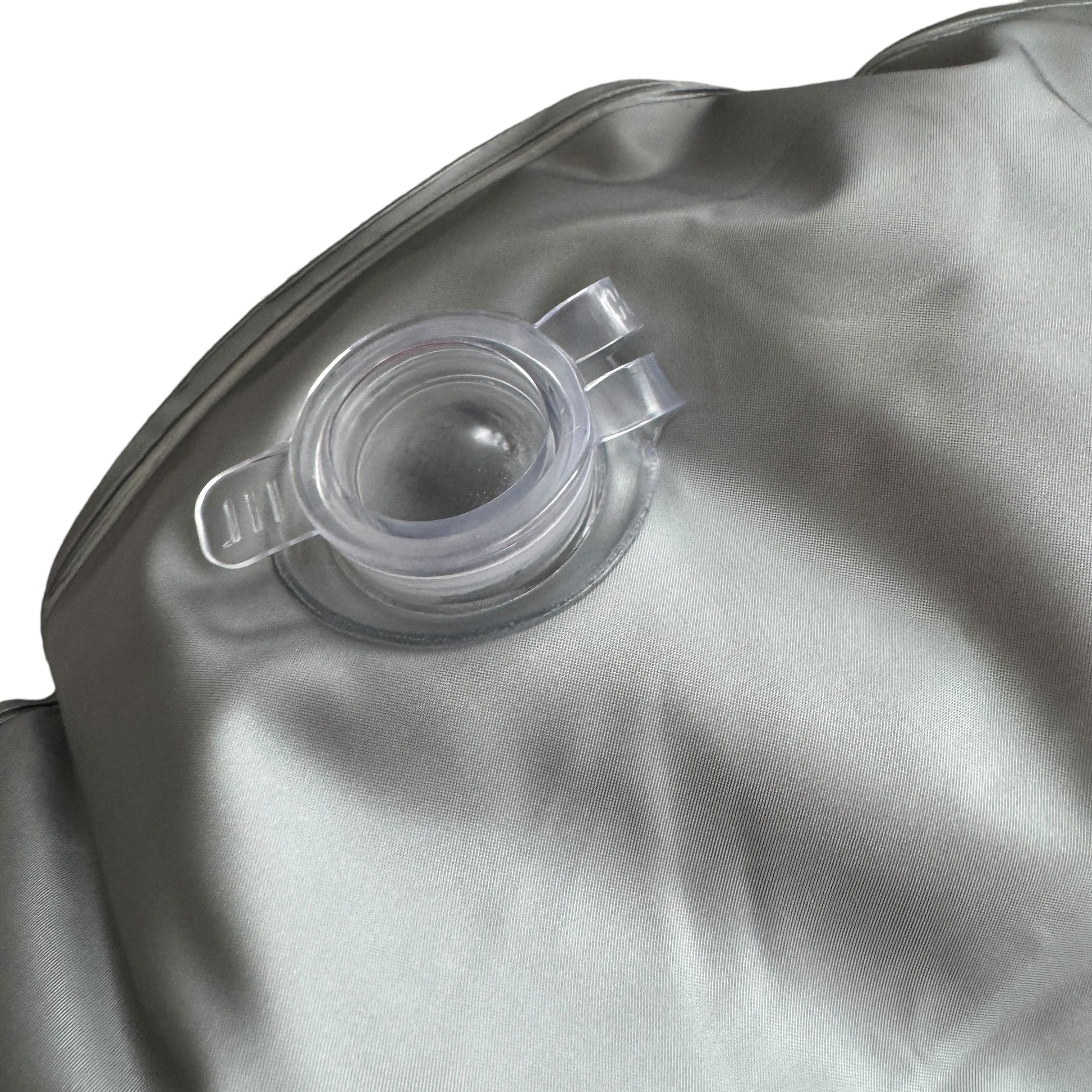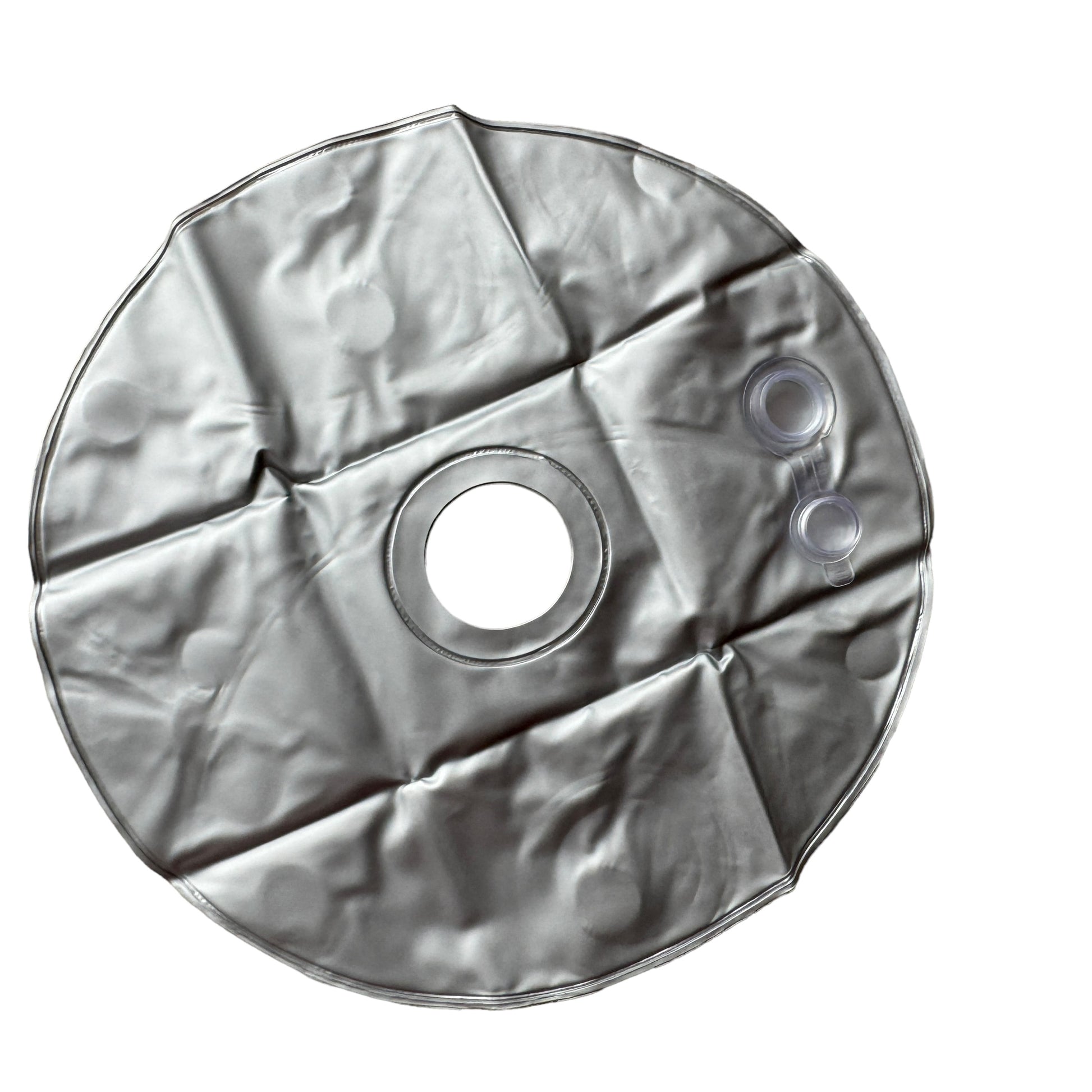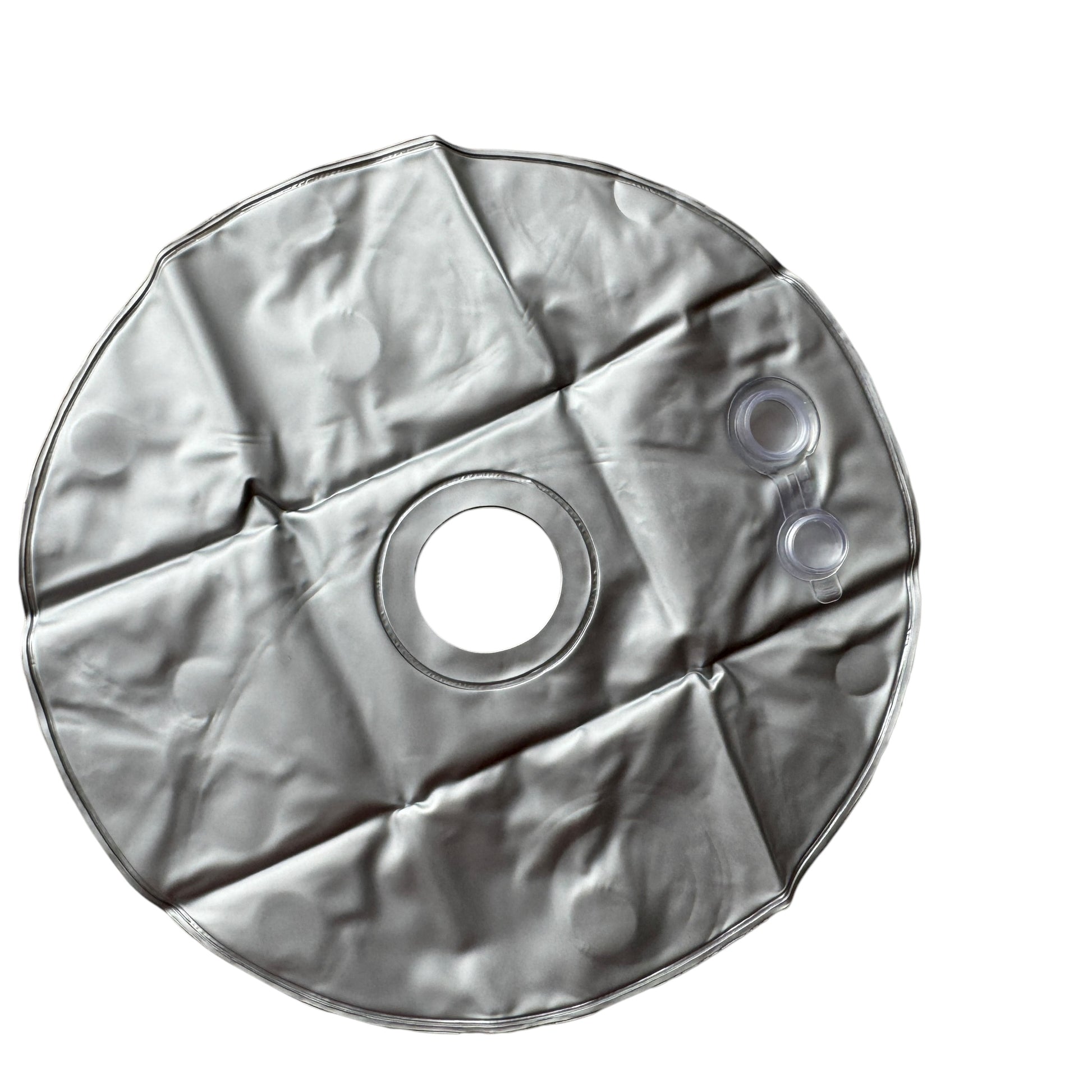 Image Description: A silver and circular pillow with a circular inner cut out for threading the balance weight onto the pole to sit around the pole and the legs of the stand once it’s been filled with water. There is a large opening plug to fill the item with water to give the stand weighted counter balance that you want for it.