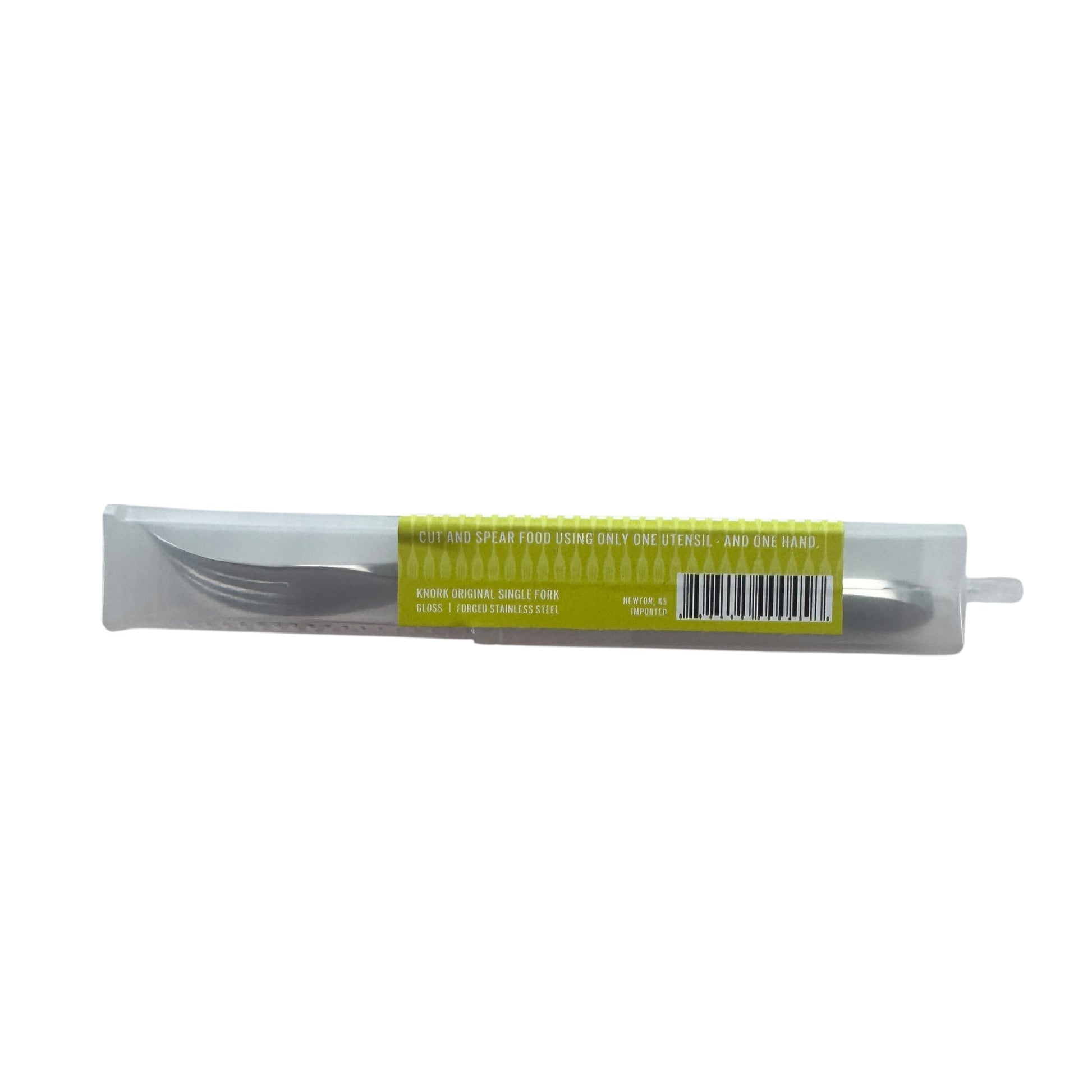 Image description: A sleek stainless steel utensil that looks like a fork but features a slightly beveled outer edge, designed for cutting food with a gentle rocking motion. The Knork combines functionality and style, offering independence and comfort with every bite.