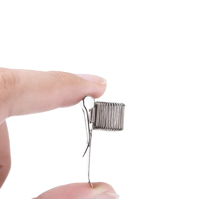 Image Description: A set of metal pen clip holders in different styles, including single and triple pen versions. Some are shown clipped to notebooks, folders, and pockets, holding pens securely in place.
