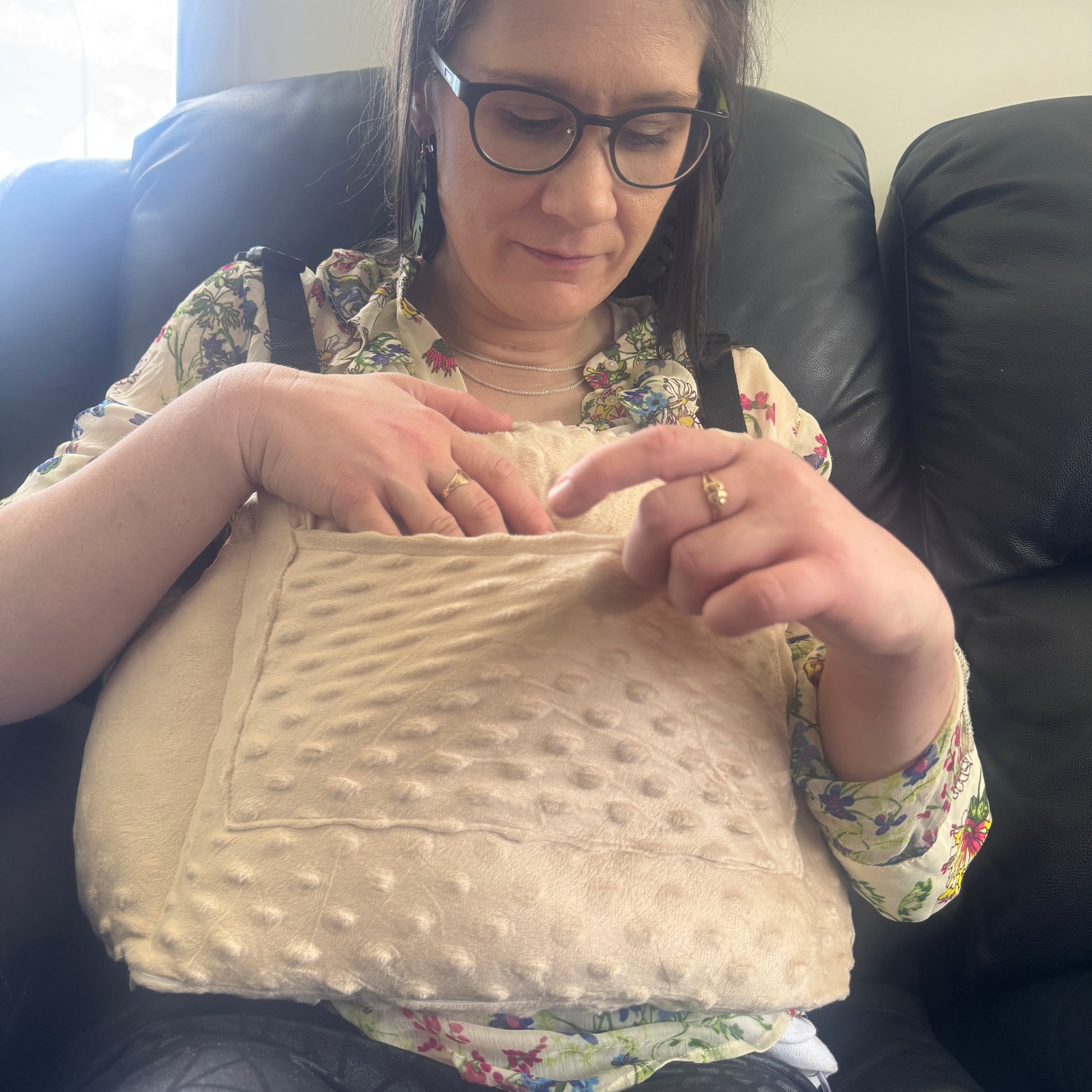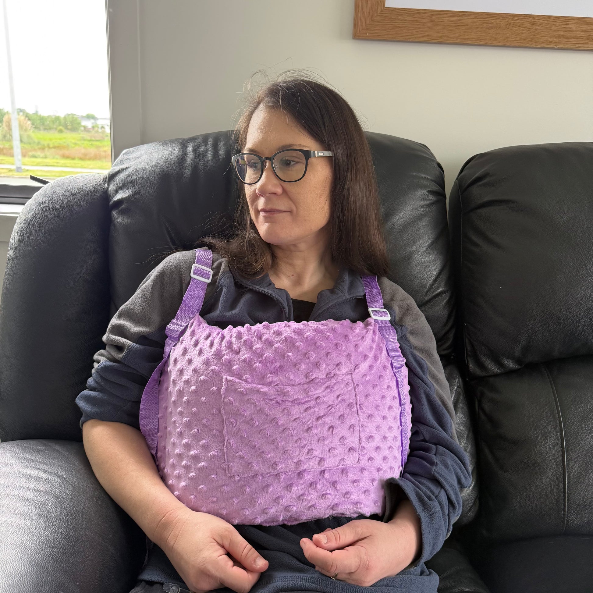 It’s shaped to wrap comfortably around the body, with raised sides to cushion under the arms and a central section that rests softly across the chest or tummy. A handy strap helps keep it in place, and a front and back pocket can hold small essentials like your phone, tissues, or a cold pack.