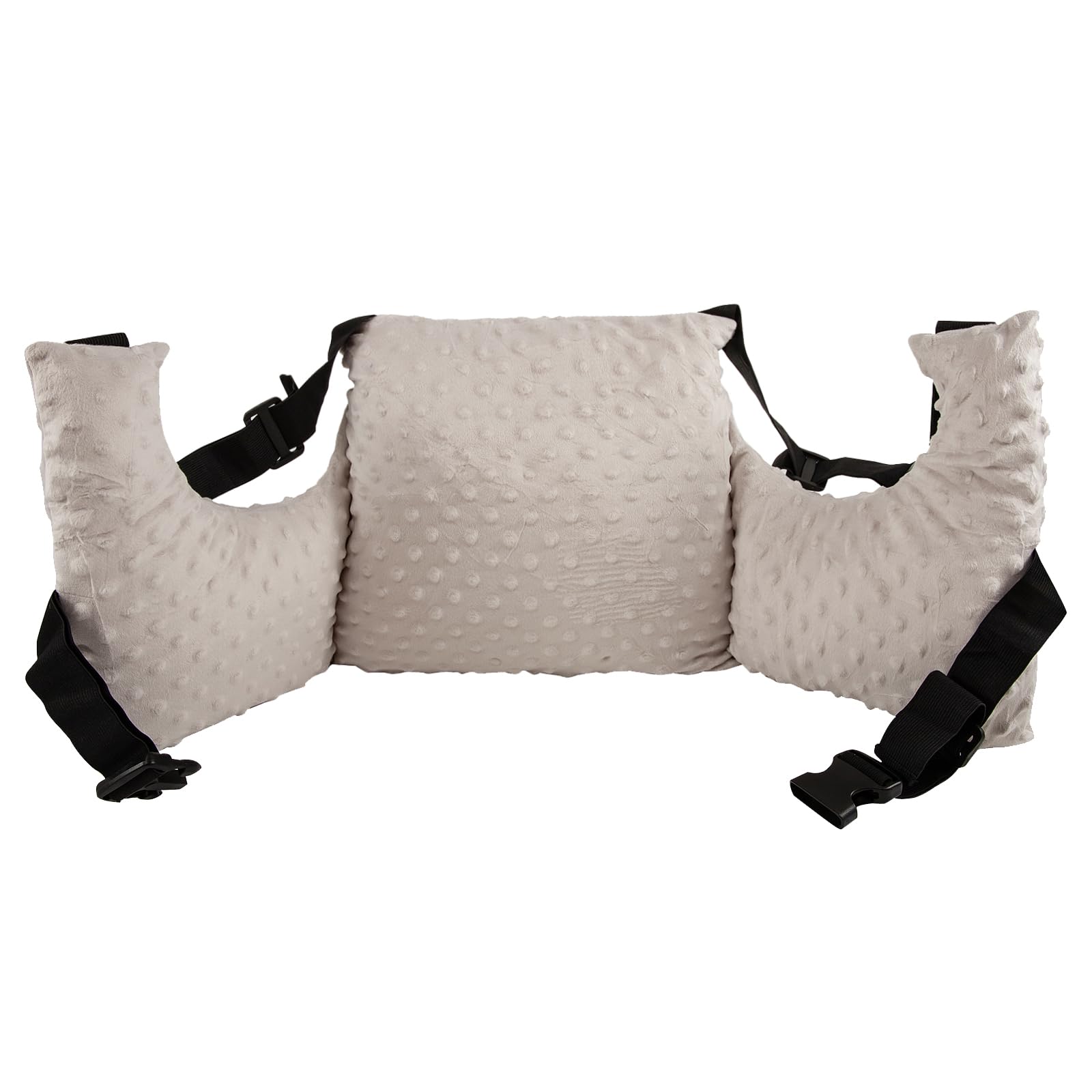 Image Description: A contoured support pillow with two raised side wings, a central cushioned panel, and a front pocket. One image shows the grey version with a chest strap and buckles. Another shows a person using a pink version on the couch, arms resting comfortably with hands inside the pocket.