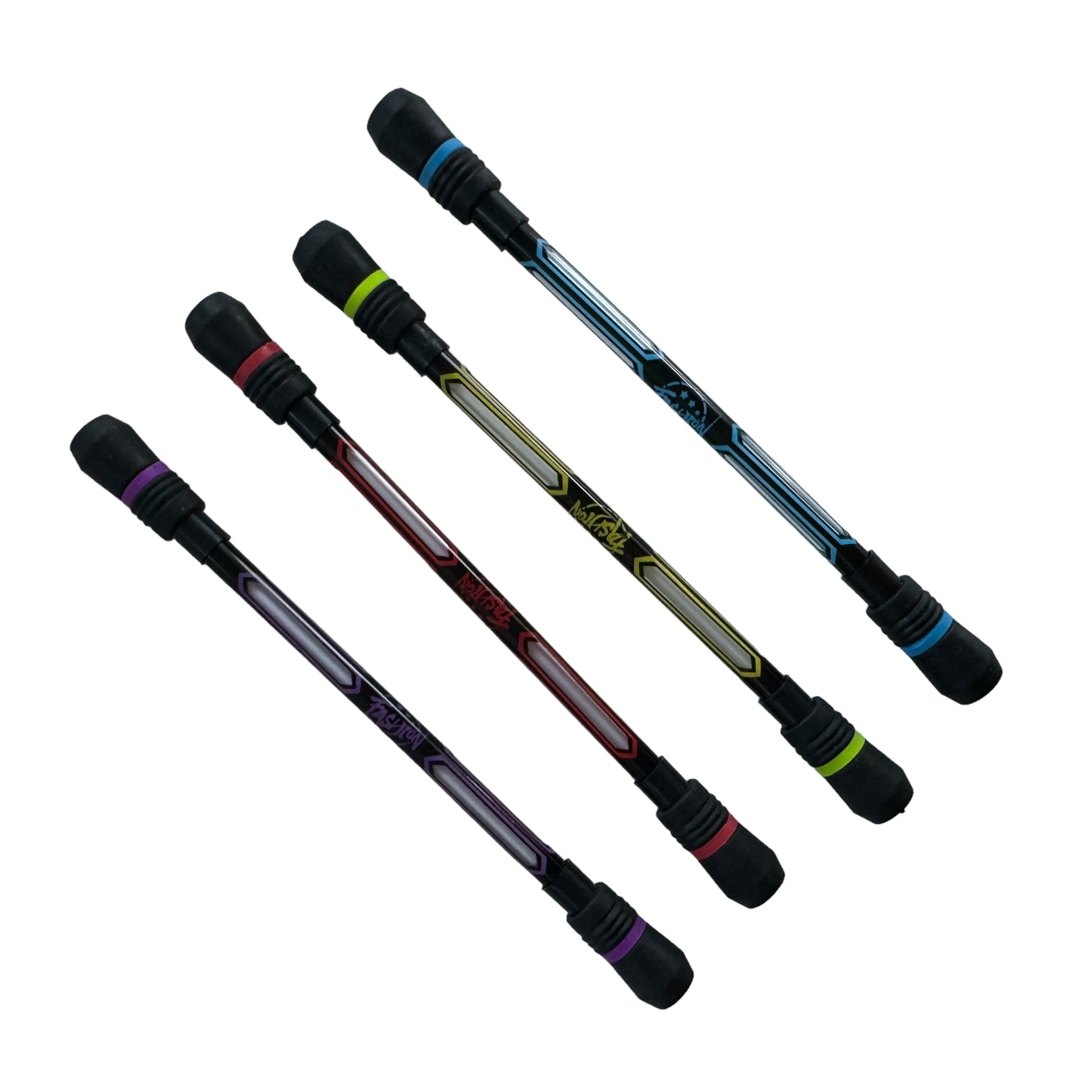 Image Description: A close-up of a weighted fidget spinning pen with smooth metal balls at both ends and a central grip area, designed to be flicked, rolled, or twirled between the fingers while also functioning as a standard writing pen.